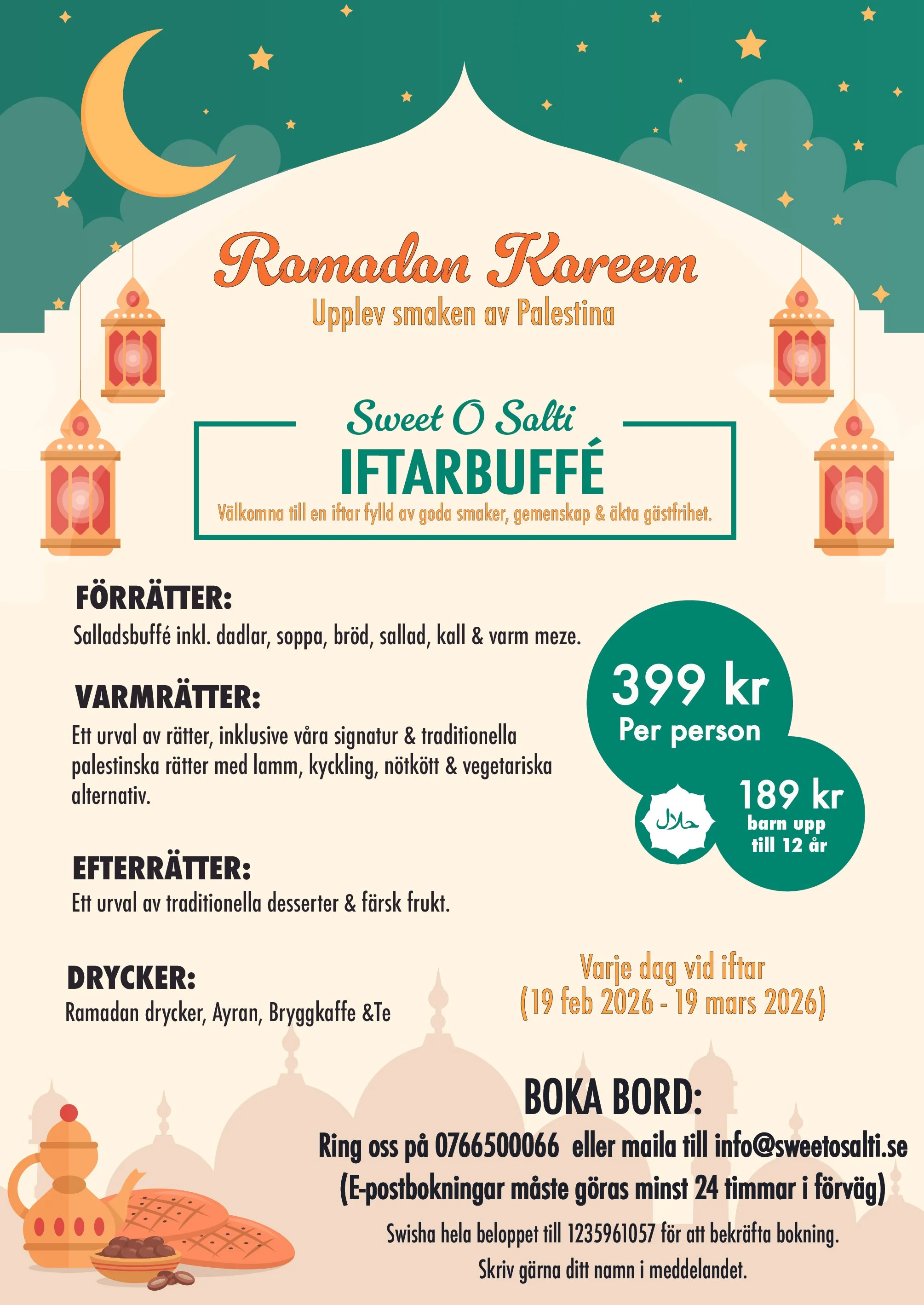 Online bokning är stängt vid Iftar tid men man kan boka via telefon 07 66 500 633 eller mejl info@sweetosalti.se.